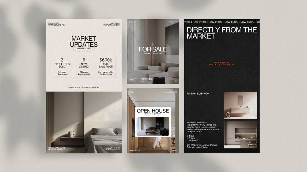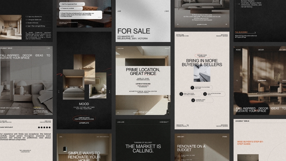 Each template is fully editable in Canva, so you can quickly customize colors, fonts, photos, and text to match your brand. Use these designs for property promotions, market tips, open house announcements, client testimonials, and building a consistent, recognizable feed.